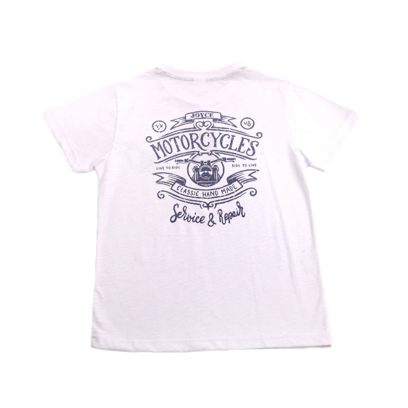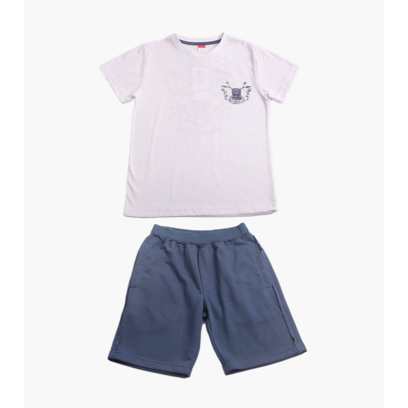Σετ με λευκή μπλούζα και στάμπα στην πλάτη και βερμούδα μακό μπλε JOYCE. Σύνθεση: